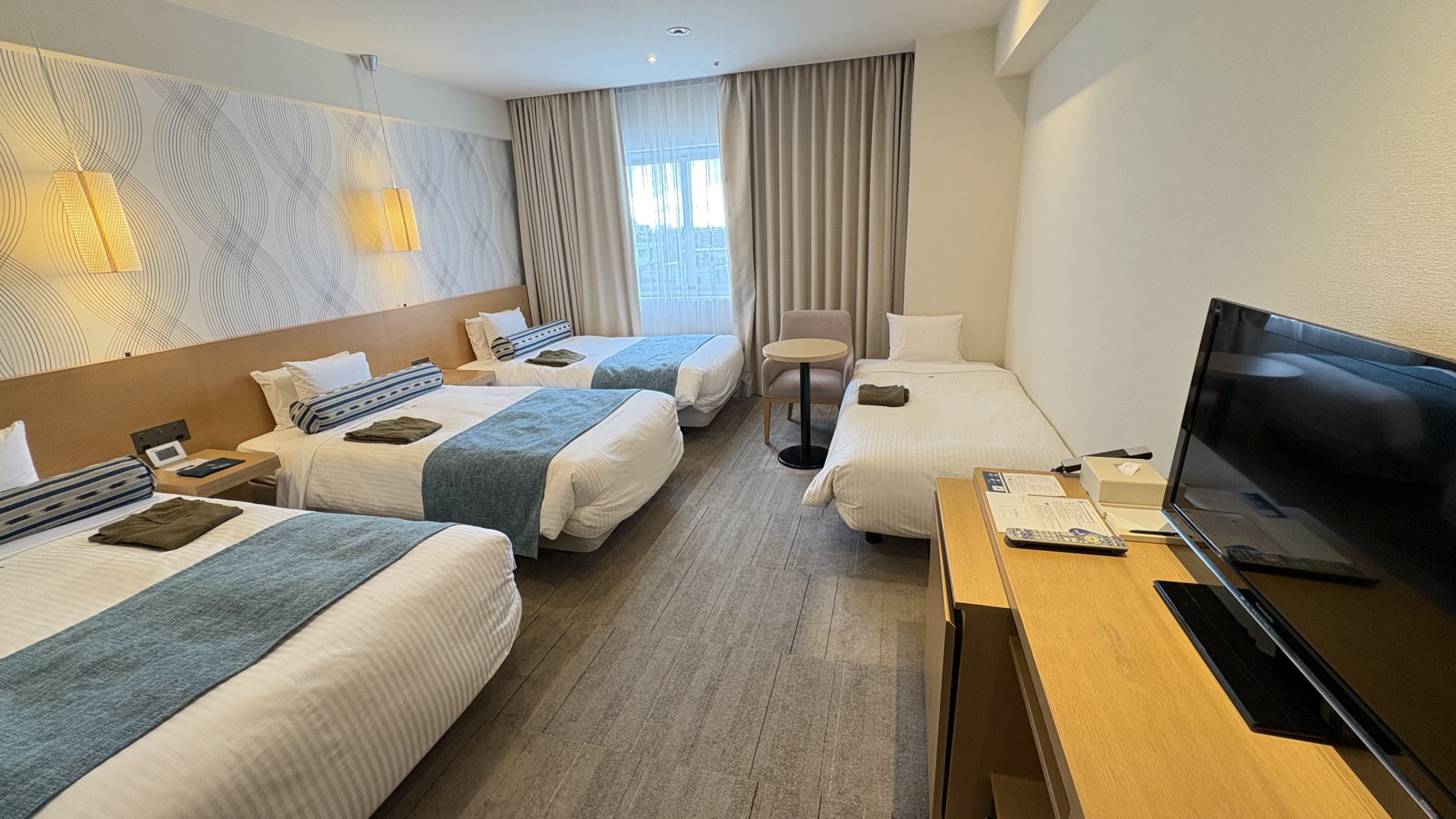フサキリゾートホテルの客室はどれもオシャレでしかもナチュラルな木目調のデザインとか、南国らしいアクセントが効いてて、リゾート感をしっかり楽しめるのが魅力です。でも、今回宿泊したスタンダードタイプの部屋はちょっとコンパクトな作りな上、ベッドを4つ用意していただいたので少し手狭に感じました。