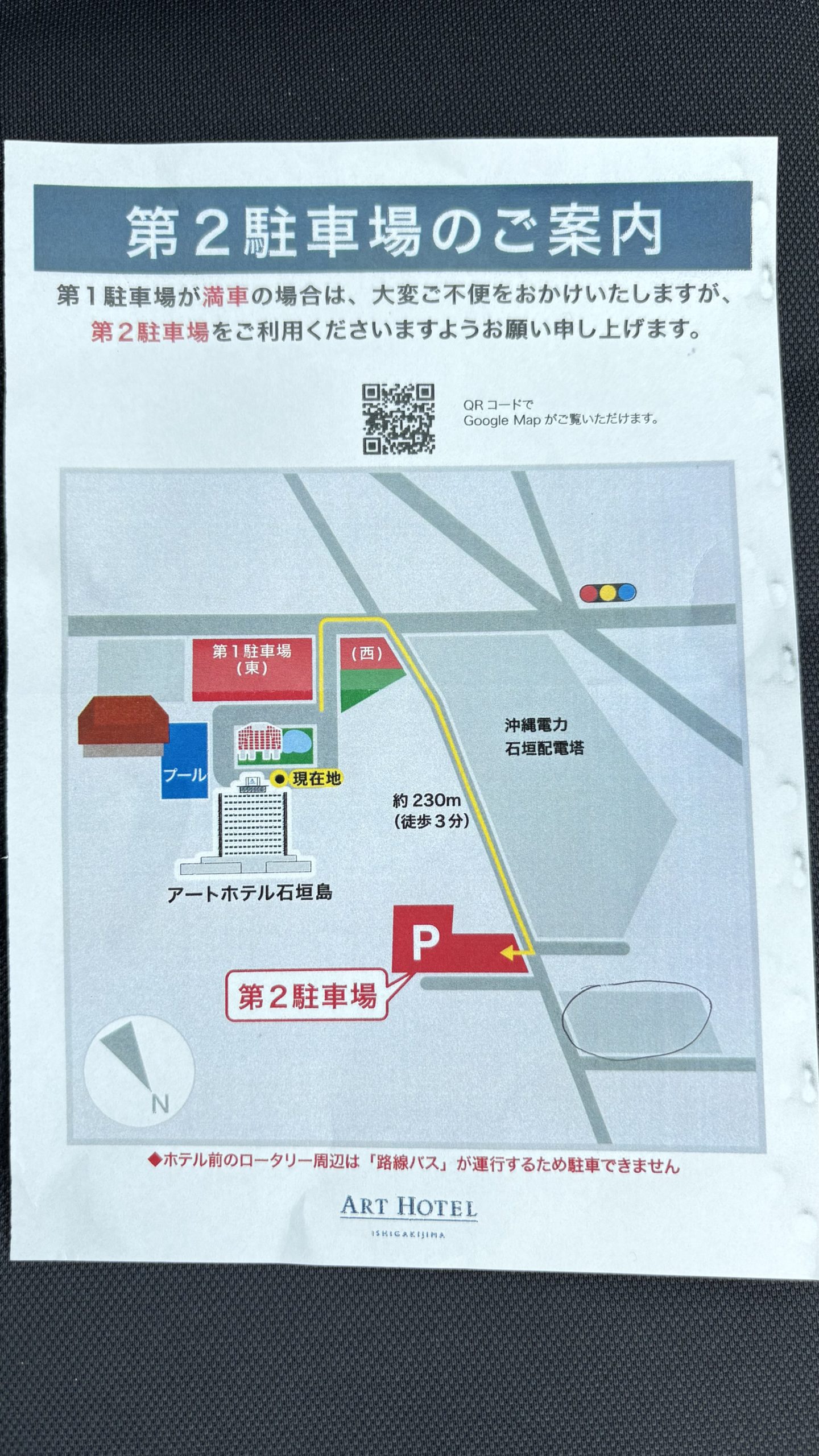 ホテルの正面にある第一駐車場は狭いので、すぐに満車になってしまいます。第二駐車場も満車だったので、さらに走って、黒丸のスペースに停める様に支持されました。ここのスペースは、地面が砂利だらけで雨がふると水たまりがいたるところにできるので、靴がビショビショになってしまいました。